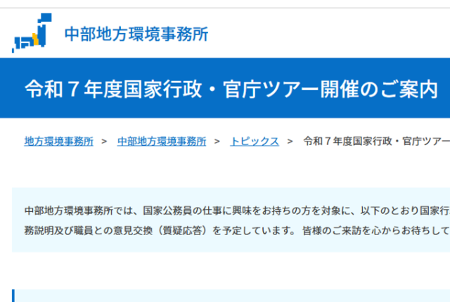 日程:2026年2月10日(火)・17日(火)中部地方環境事務所の業務説明・職員との意見交換(質疑応答)を予定しています。