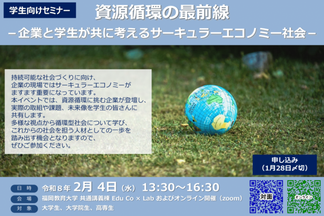 日時:2026年2月4日(水)13:30~16:30/場所:福岡教育大学+オンライン(zoom)/対象:高専生、大学生、大学院生