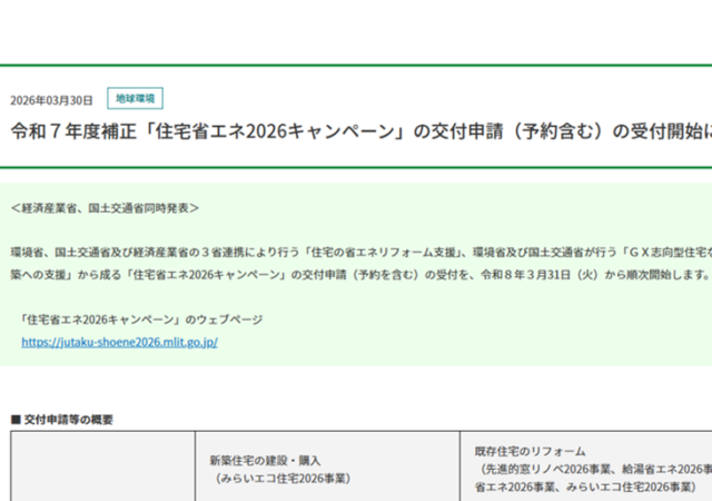 「住宅省エネ2026キャンペーン」の交付申請の受付を令和8年3月31日(火)から順次開始。