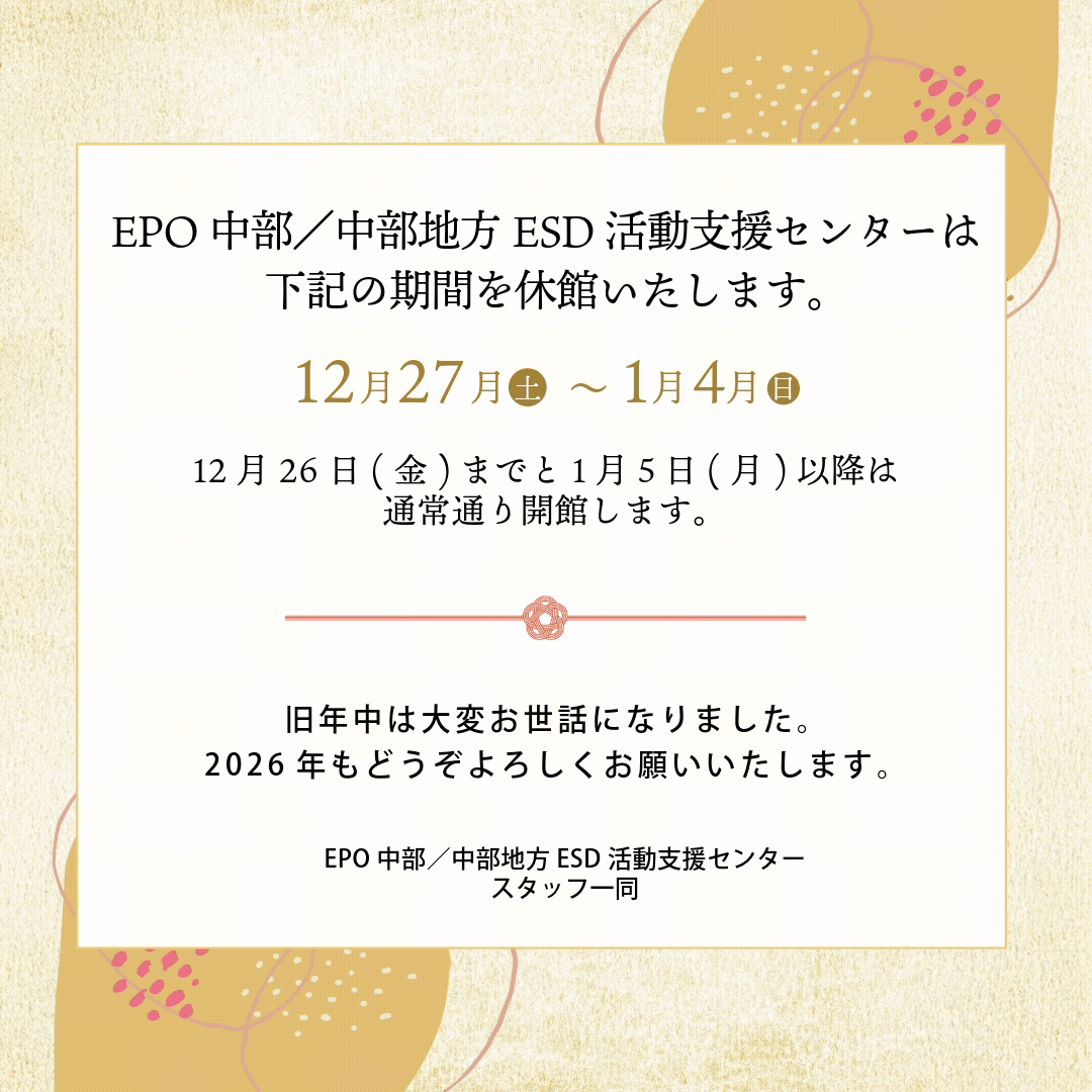 EPO中部/中部地方ESD活動支援センターは、下記の期間を休館いたします。