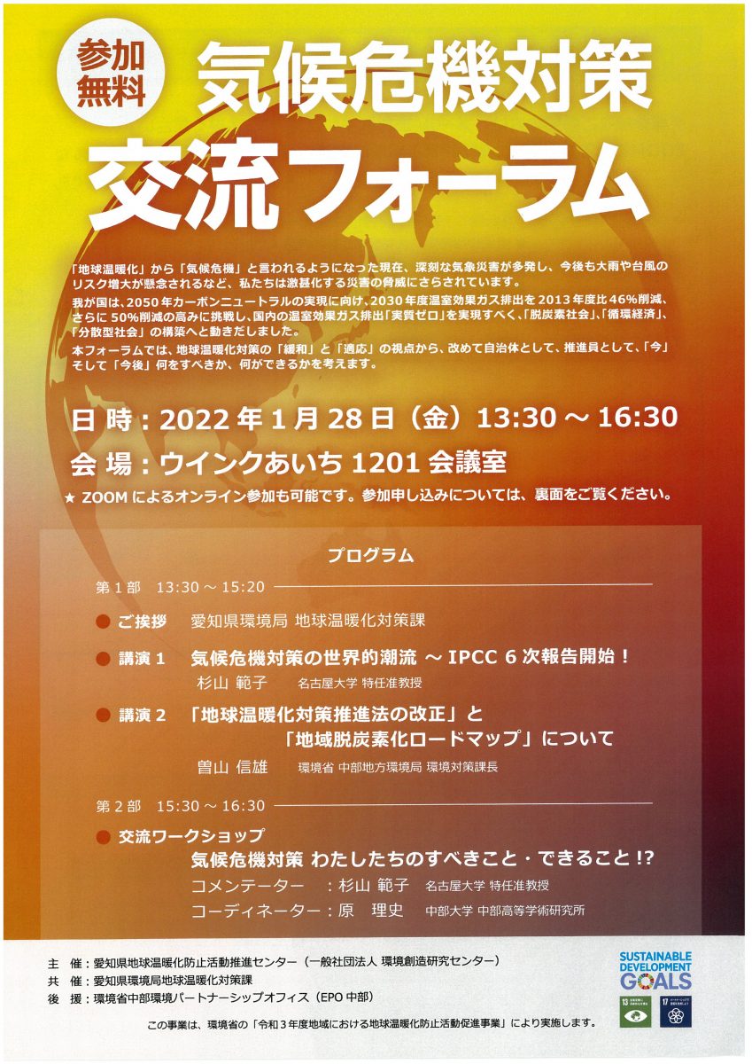 愛知県地球温暖化防止活動推進センター(一般社団法人環境創造研究センター)主催で「気候危機対策 交流フォーラム」を開催します。