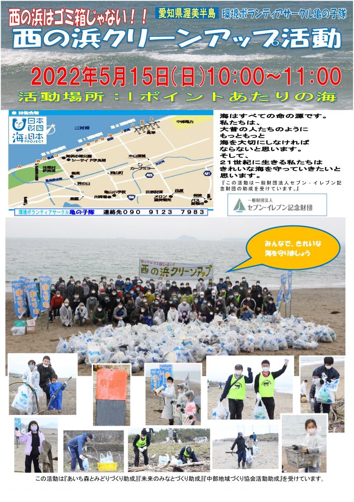 環境ボランティアサークル亀の子隊は、渥美半島 西の浜クリーンアップ活動を実施します。