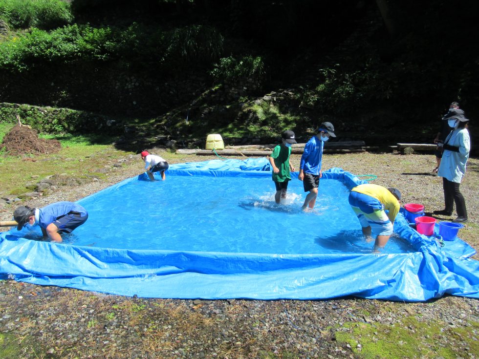 暑い夏の一日、感染症予防のため、遠くに行けない子供たちは、川遊び、イワナ掴み、そして薪割りなど親子で楽しいひと時を過ごしました。