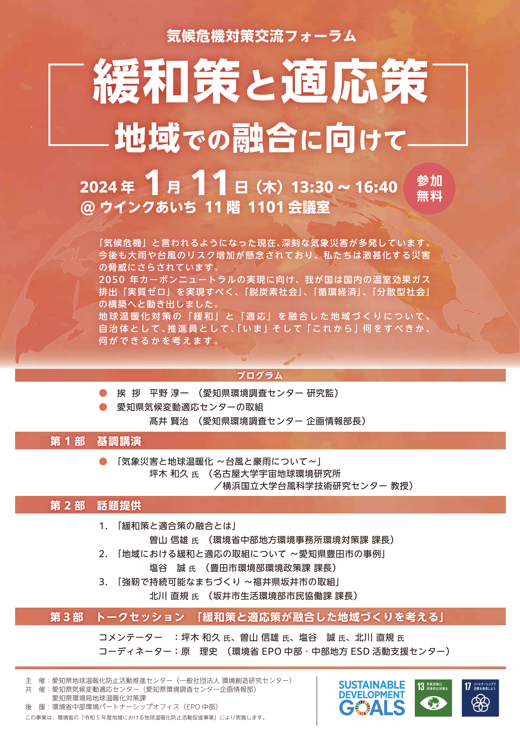 愛知県地球温暖化防止活動推進センター(一般社団法人環境創造研究センター)は、気候危機対策交流フォーラム「緩和策と適応策―地域での融合に向けて―」を開催します。