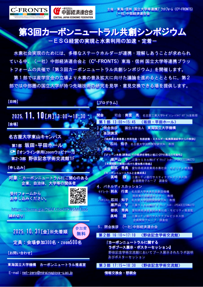 中部経済連合会とC²-FRONTS(東海・信州 国立大学等連携プラットフォーム)との共催で水素をテーマとしたイベントを開催します。