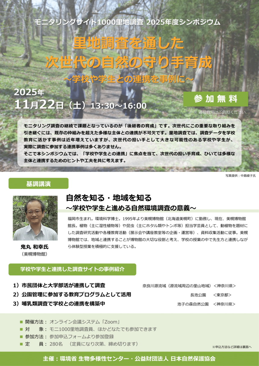 モニタリングサイト1000里地調査 2025年度シンポジウム「里地調査を通した次世代の自然の守り手育成~学校や学生との連携を事例に~」を開催