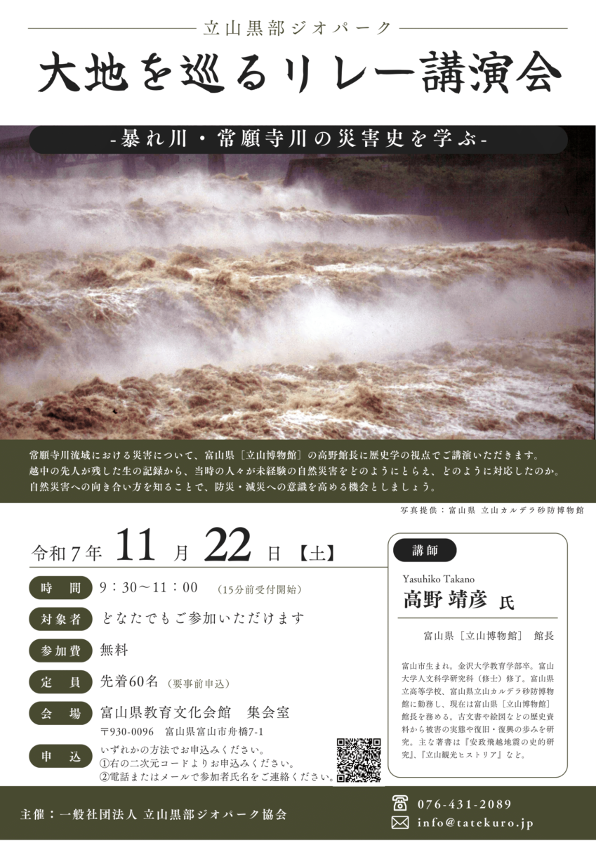 一般社団法人立山黒部ジオパーク協会は、「大地を巡るリレー講演会~暴れ川・常願寺川の災害史を学ぶ~」を開催します。