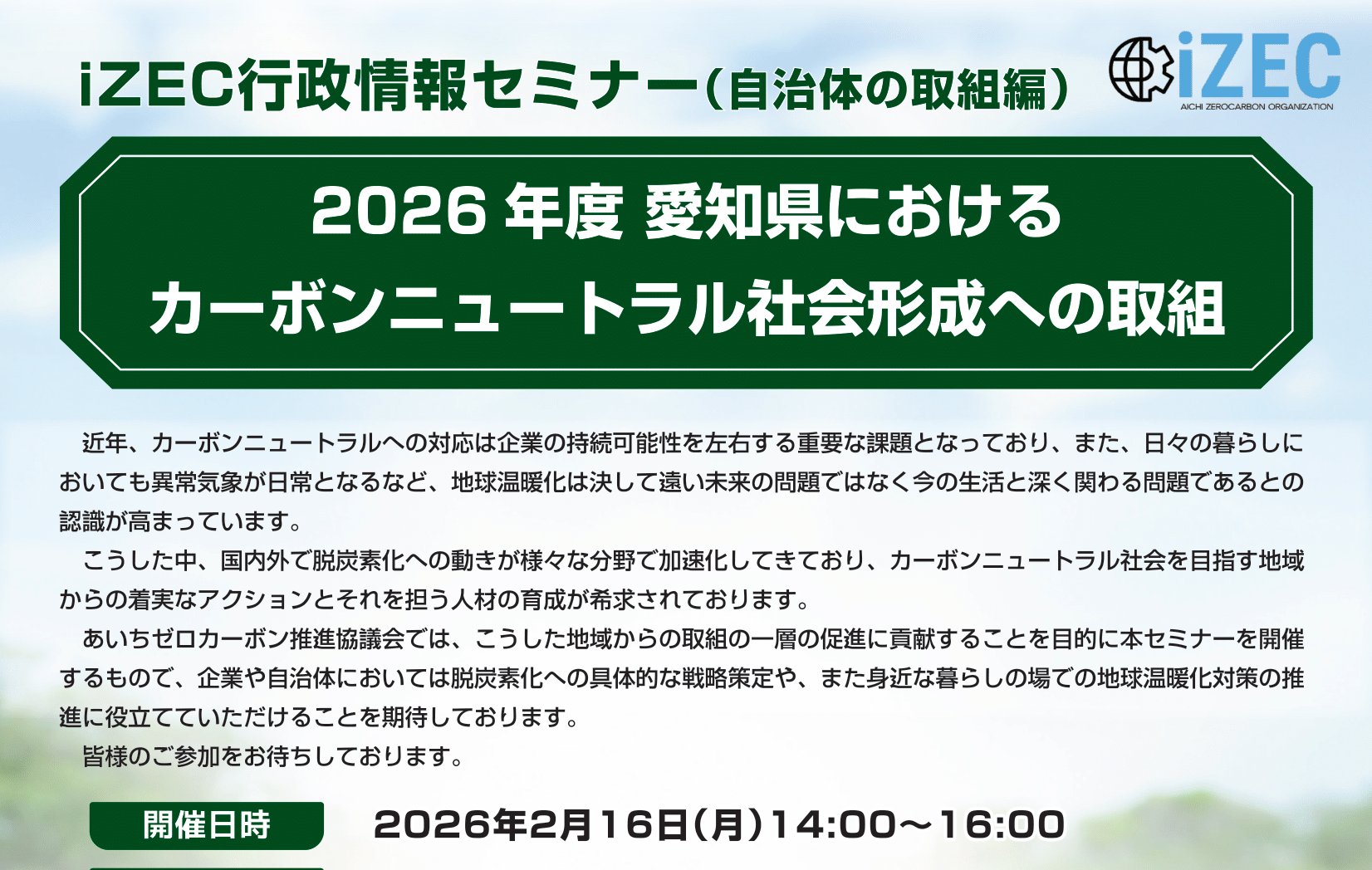 iZEC行政情報セミナー(自治体の取組編)2026年度愛知県におけるカーボンニュートラル社会形成への取組を開催(愛知)