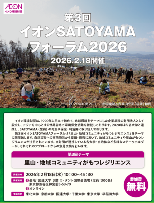 公益財団法人イオン環境財団は、「里山・地域コミュニティがもつレジリエンス」をテーマに、第3回イオンSATOYAMAフォーラムを開催します。