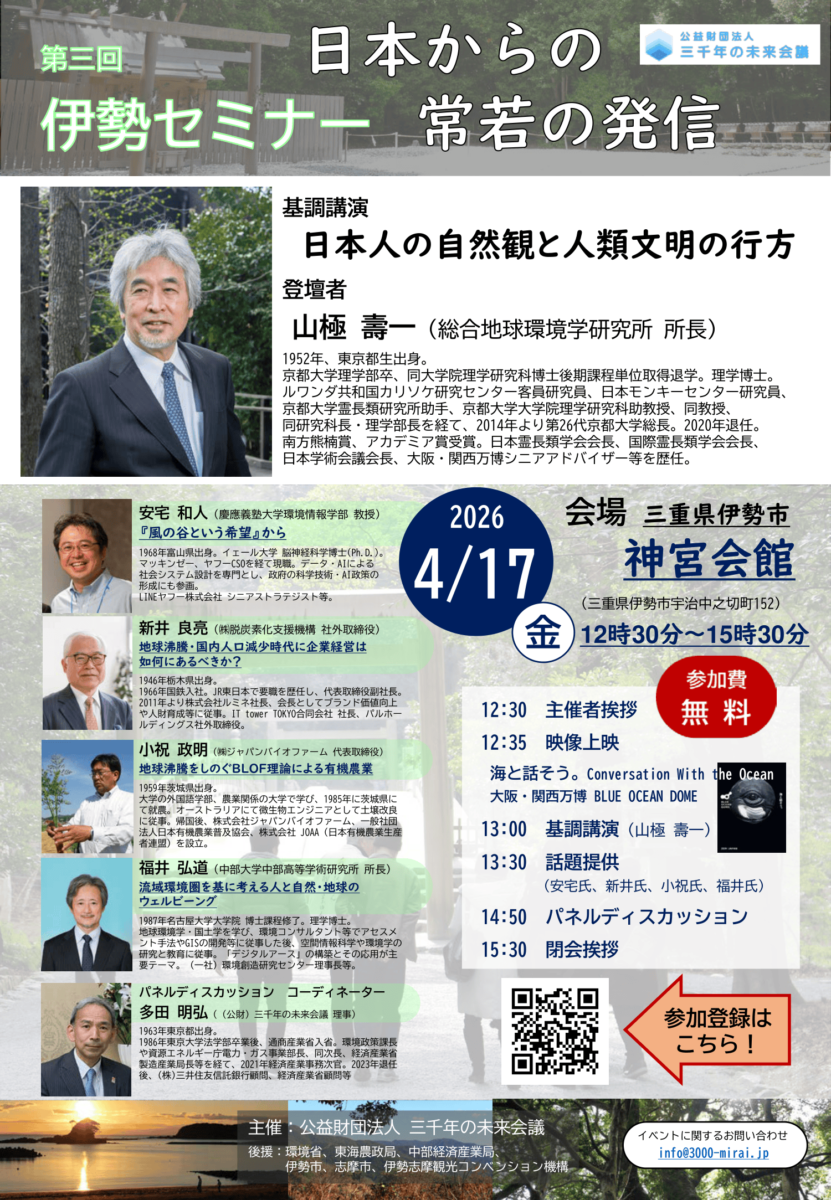 一般財団法人三千年の未来会議は、第三回伊勢セミナーを開催します。