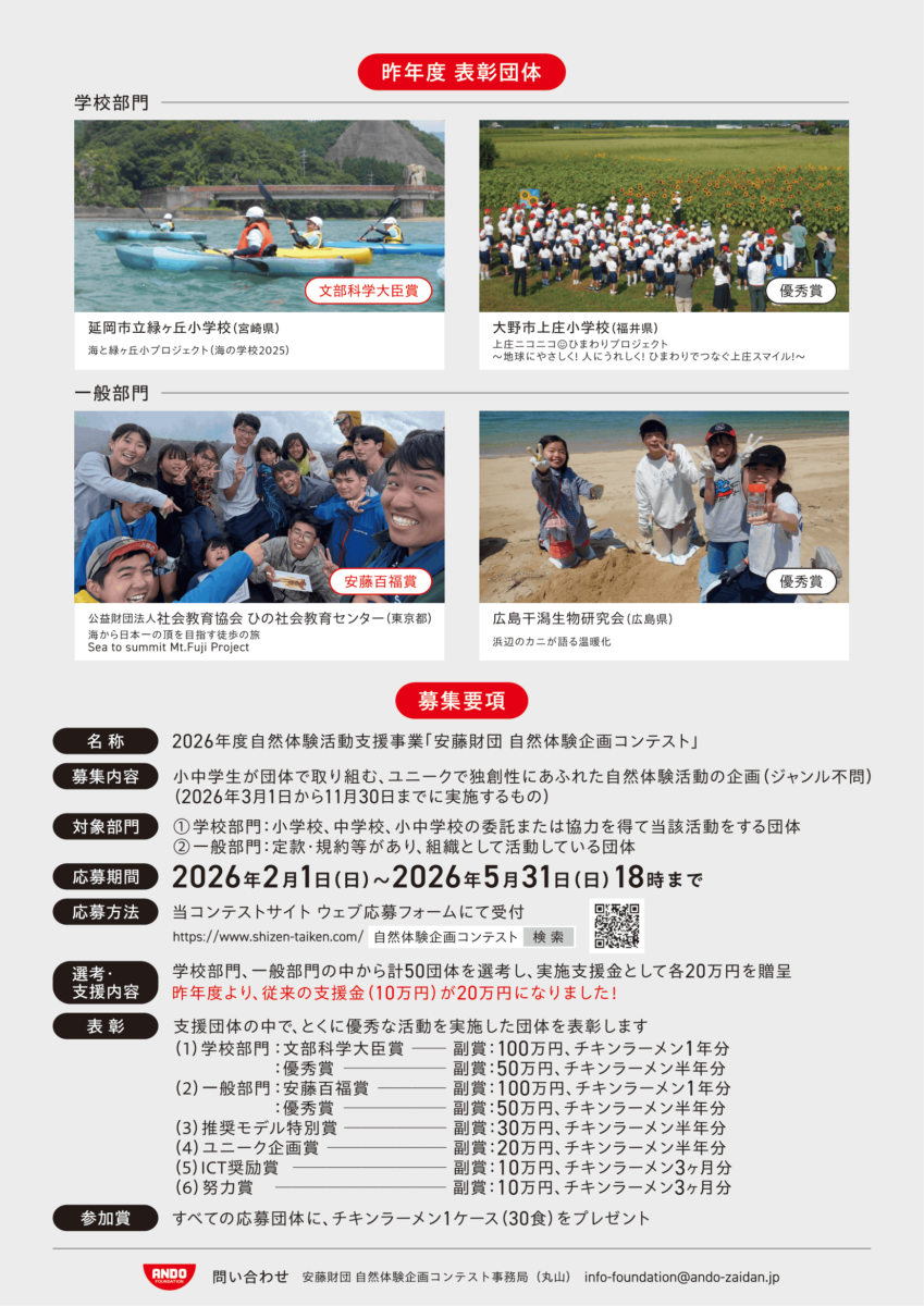 2026年度自然体験活動支援事業「安藤財団 自然体験企画コンテスト」を実施