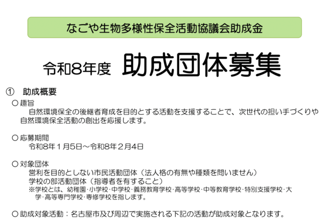 令和8年度なごや生物多様性保全活動協議会助成金~助成団体募集~