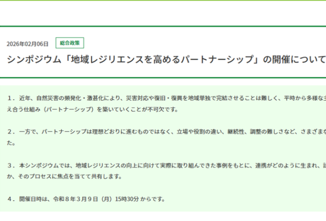 シンポジウム「地域レジリエンスを高めるパートナーシップ」を開催
