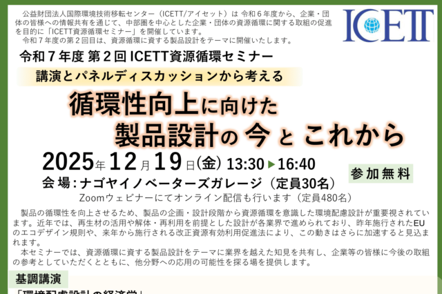 ICETT資源循環セミナー「循環性向上に向けた製品設計の今とこれから」を開催(愛知)